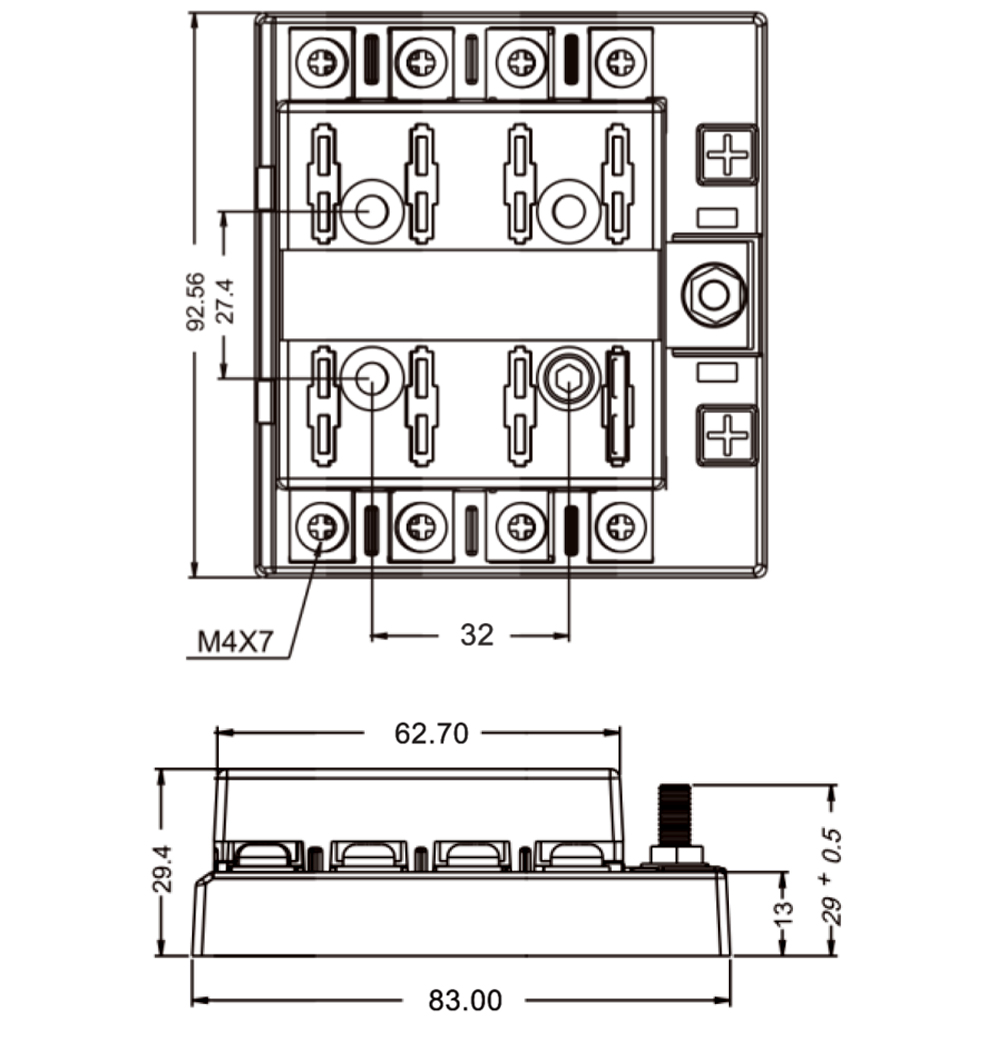 产品特点:保险丝座含有四个5.5mm螺孔,用于固定保险丝座。拥有透明的防尘防潮盖,更坚固更轻便的结构。黑色底座阻燃等级达到94V-0。