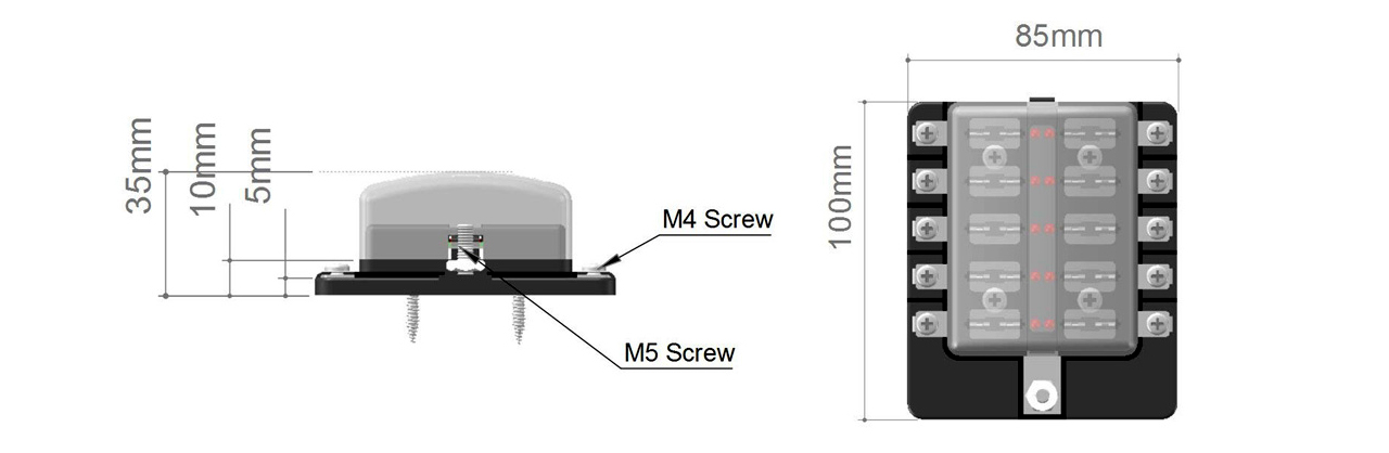 产品特点:保险丝座含有四个5.5mm螺孔,用于固定保险丝座。拥有透明的防尘防潮盖,更坚固更轻便的结构。黑色底座阻燃等级达到94V-0。